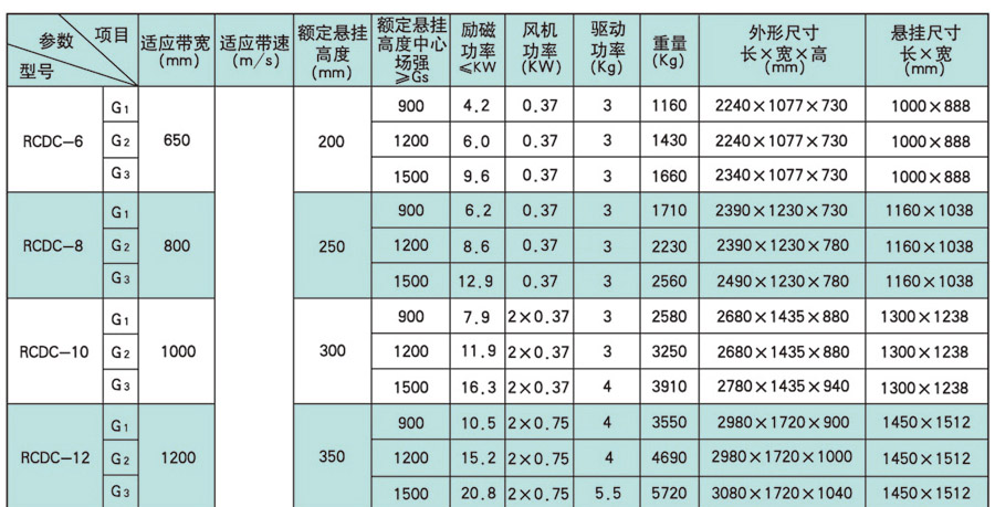 RCDC-口G系列高強磁懸掛式電磁除鐵器采用軸流風機強迫風冷,其磁場梯度、吸力遠高于普通除鐵器。