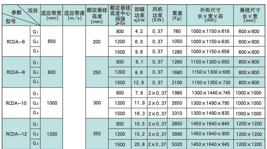 RCDA-口G系列高強磁懸掛式電磁除鐵器采用軸流風機強迫風冷,其磁場梯度、吸力遠高于普通除鐵器。